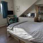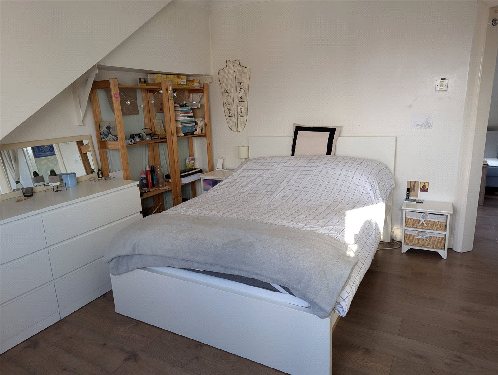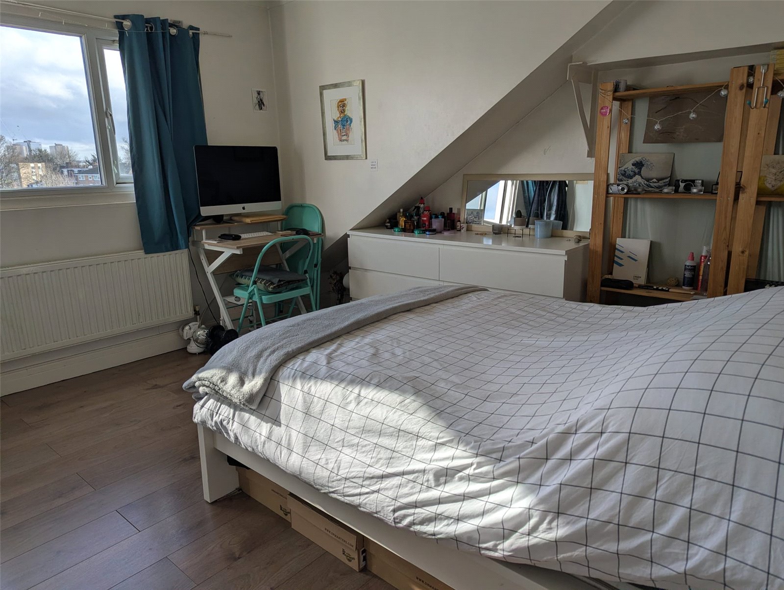 - good size loft style bedroom with wooden flooring,
