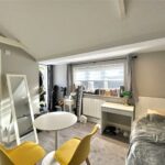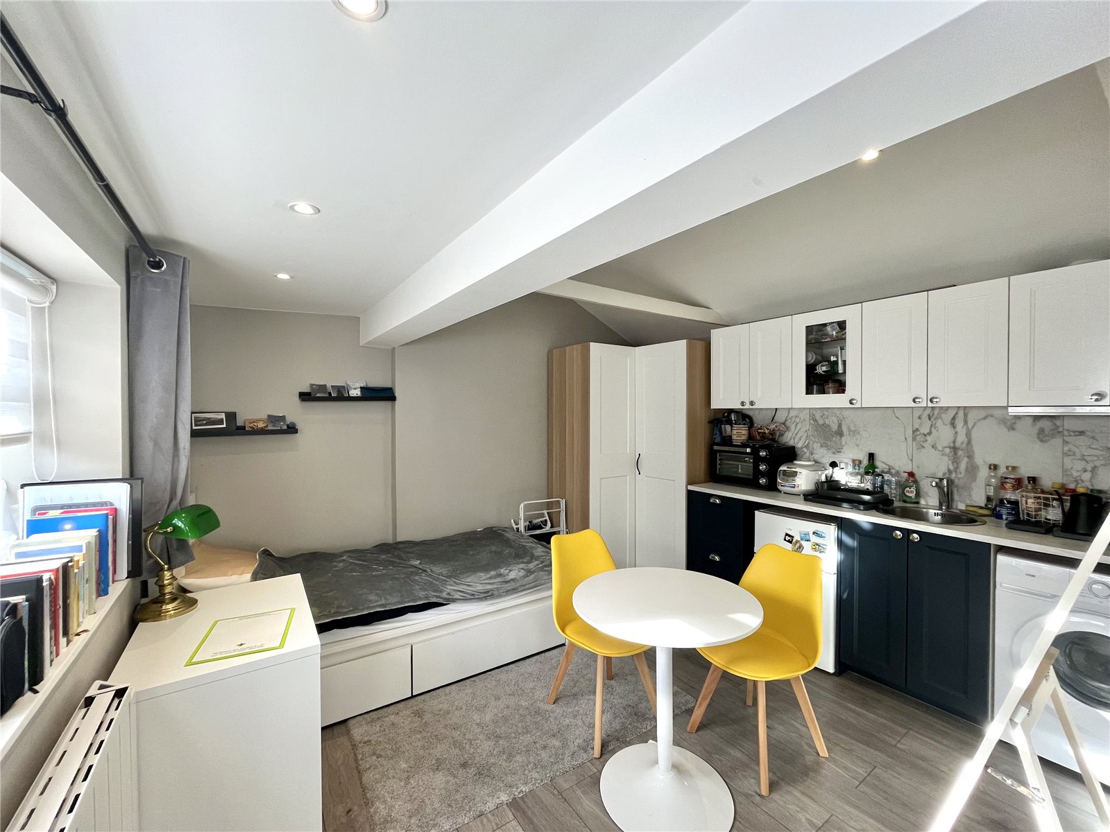 - A bright, well-proportioned studio room furnished with a single bed and wardrobes