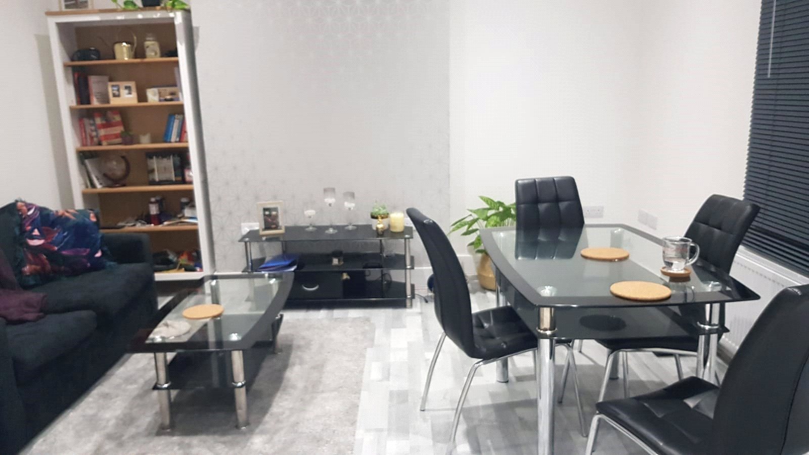- a living room with semi-open plan fitted kitchen, - bathroom with bath and overhead shower.