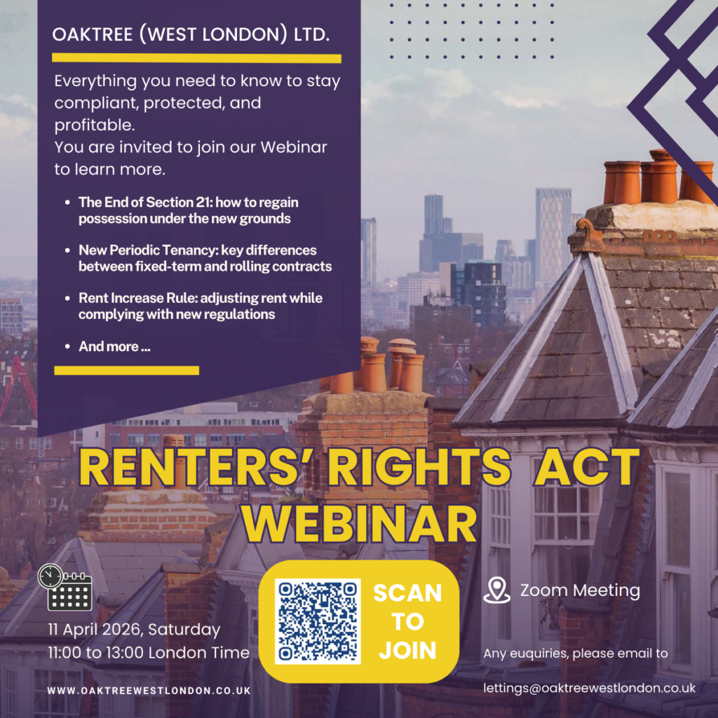 Oaktree (West London) Ltd are pleased to invite landlords to an upcoming webinar on 11 April (Sat), focusing on the highly anticipated Renters’ Rights Act.